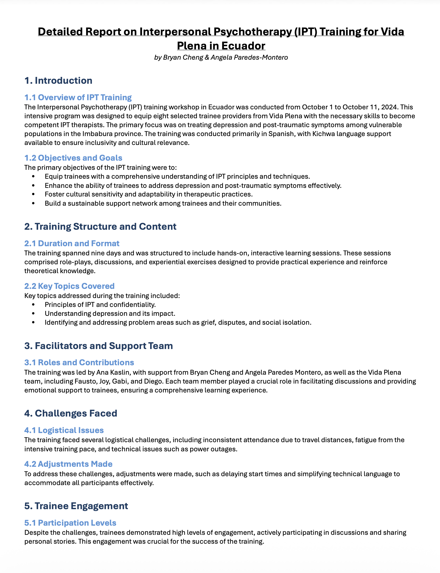 Detailed Report on Interpersonal Psychotherapy (IPT) Training for Vida Plena in Ecuador