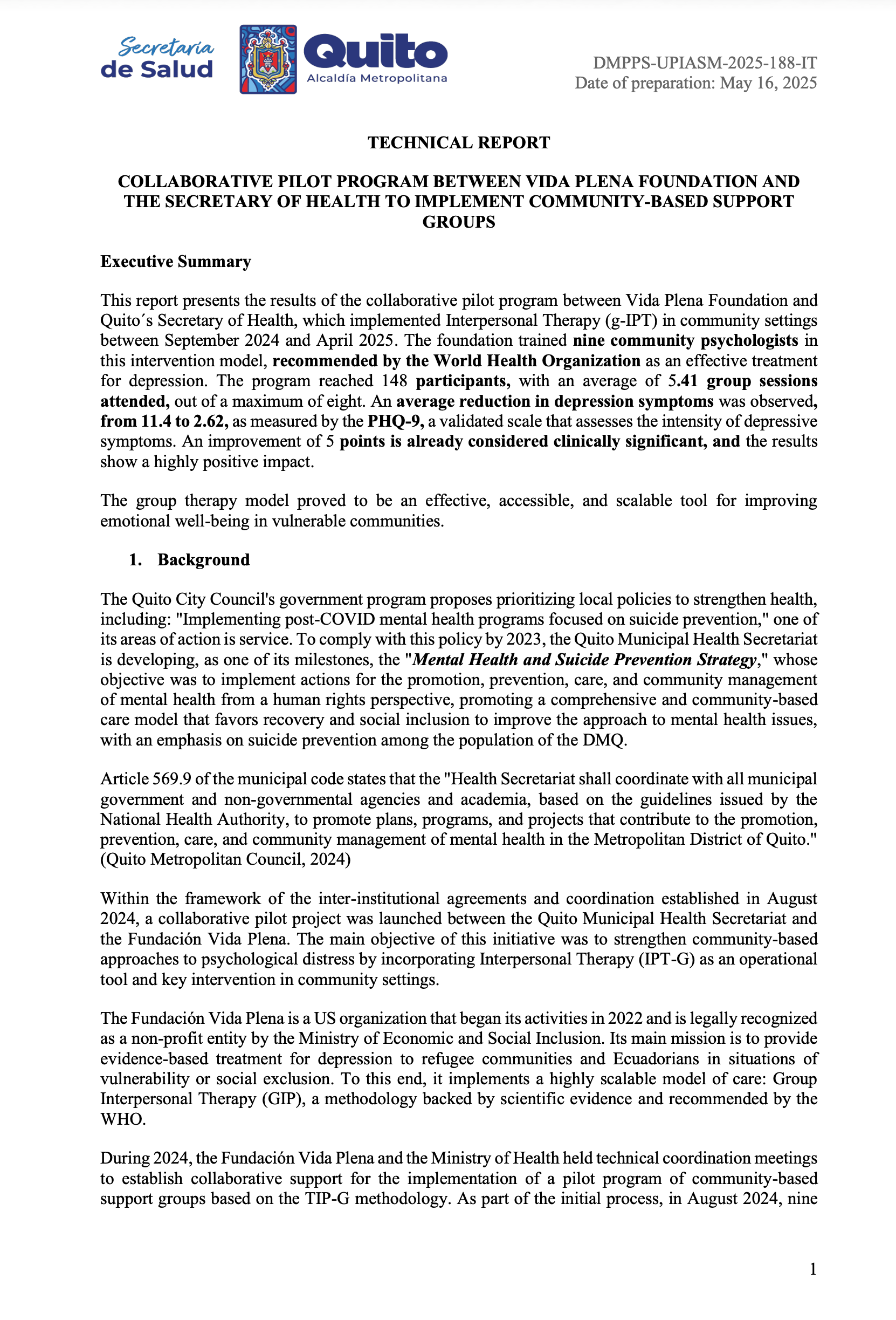 This report presents the results of the collaborative pilot program between Vida Plena Foundation and Quito´s Secretary of Health, which implemented Interpersonal Therapy (g-IPT) in community settings between September 2024 and April 2025.